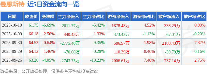 证券之星消息,截至2025年10月10日收盘,曼恩斯特(301325)报收于61.75元,下跌6.69%,换手率10.22%,成交量5.92万手,成交额3.71亿元。