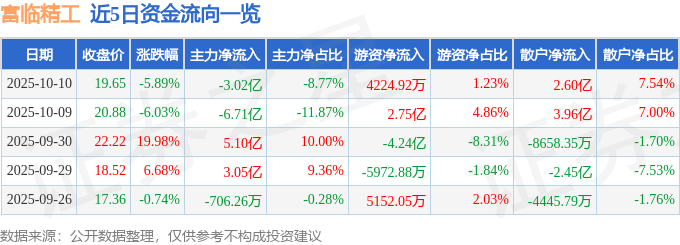 证券之星消息,截至2025年10月10日收盘,富临精工(300432)报收于19.65元,下跌5.89%,换手率10.12%,成交量171.04万手,成交额34.45亿元。