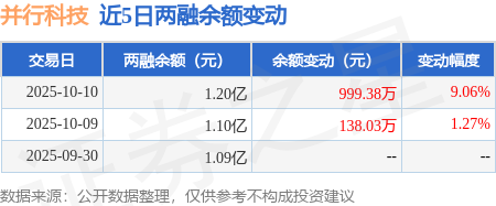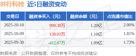 证券之星消息,10月10日,并行科技(920493)融资买入1901.53万元,融资偿还902.14万元,融资净买入999.38万元,融资余额1.2亿元。