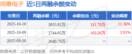 证券之星消息,10月10日,同惠电子(920509)融资买入1817.64万元,融资偿还1505.86万元,融资净买入311.78万元,融资余额3055.82万元。