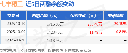 证券之星消息,10月10日,七丰精工(920169)融资买入450.74万元,融资偿还162.35万元,融资净买入288.4万元,融资余额1716.85万元。