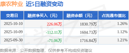 证券之星消息,10月10日,康农种业(920403)融资买入455.07万元,融资偿还229.0万元,融资净买入226.06万元,融资余额1830.79万元。