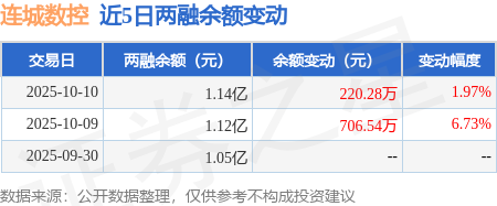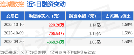 证券之星消息,10月10日,连城数控(920368)融资买入1075.58万元,融资偿还855.31万元,融资净买入220.28万元,融资余额1.14亿元。