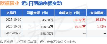 证券之星消息,10月10日,欧福蛋业(920371)融资买入248.05万元,融资偿还61.21万元,融资净买入186.83万元,融资余额1345.38万元,近3个交易日已连续净买入累计259.29万元。