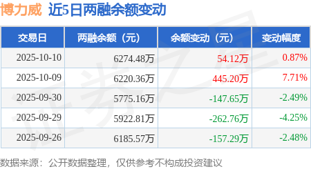 证券之星消息,10月10日,博力威(688345)融资买入905.23万元,融资偿还851.11万元,融资净买入54.12万元,融资余额6274.48万元。