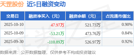 证券之星消息,10月10日,天罡股份(920651)融资买入107.85万元,融资偿还59.88万元,融资净买入47.97万元,融资余额521.73万元。