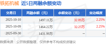 证券之星消息,10月10日,铁拓机械(920706)融资买入128.22万元,融资偿还95.33万元,融资净买入32.89万元,融资余额1497.11万元。