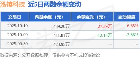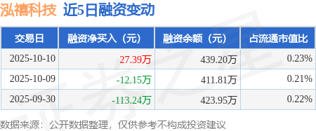 证券之星消息,10月10日,泓禧科技(920857)融资买入157.88万元,融资偿还130.49万元,融资净买入27.39万元,融资余额439.2万元。