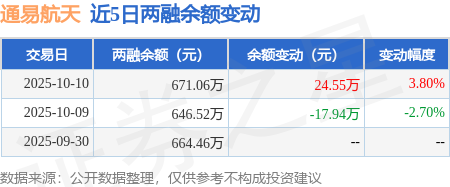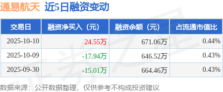证券之星消息,10月10日,通易航天(920642)融资买入86.08万元,融资偿还61.54万元,融资净买入24.55万元,融资余额671.06万元。