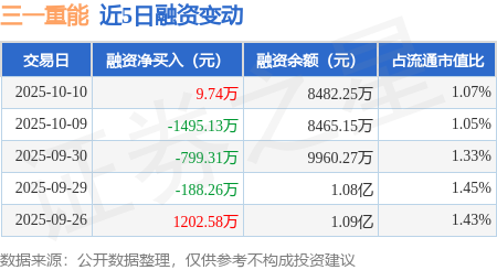 证券之星消息,10月10日,三一重能(688349)融资买入1338.12万元,融资偿还1328.38万元,融资净买入9.74万元,融资余额8482.25万元。