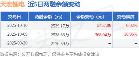 证券之星消息,10月10日,天宏锂电(920252)融资买入444.89万元,融资偿还444.35万元,融资净买入0.55万元,融资余额2539.17万元。