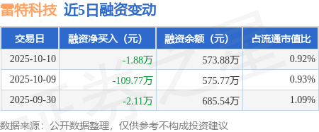证券之星消息,10月10日,雷特科技(920110)融资买入13.45万元,融资偿还15.34万元,融资净卖出1.88万元,融资余额573.88万元。