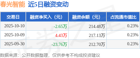 证券之星消息,10月10日,春光智能(920810)融资买入13.21万元,融资偿还15.86万元,融资净卖出2.65万元,融资余额214.48万元。