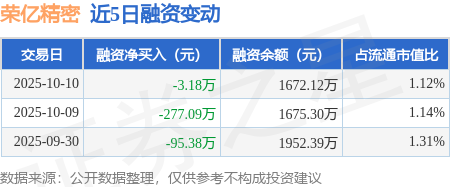 证券之星消息,10月10日,荣亿精密(920223)融资买入145.66万元,融资偿还148.84万元,融资净卖出3.18万元,融资余额1672.12万元。