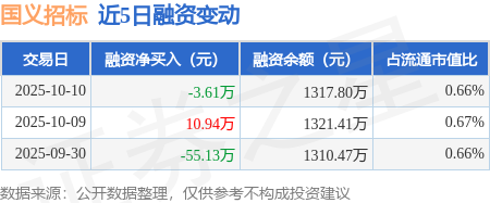 证券之星消息,10月10日,国义招标(920039)融资买入90.17万元,融资偿还93.78万元,融资净卖出3.61万元,融资余额1317.8万元。