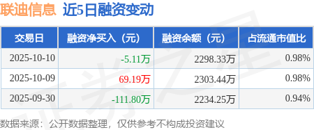 证券之星消息,10月10日,联迪信息(920790)融资买入148.52万元,融资偿还153.63万元,融资净卖出5.11万元,融资余额2298.33万元。