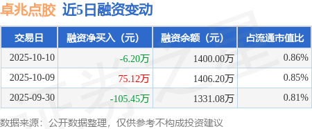 证券之星消息,10月10日,卓兆点胶(920026)融资买入105.05万元,融资偿还111.25万元,融资净卖出6.2万元,融资余额1400.0万元。
