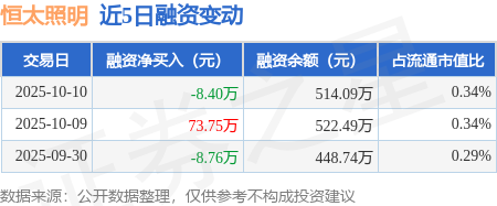 证券之星消息,10月10日,恒太照明(920339)融资买入20.9万元,融资偿还29.3万元,融资净卖出8.4万元,融资余额514.09万元。