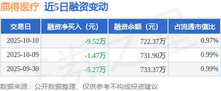 证券之星消息,10月10日,鹿得医疗(920278)融资买入25.58万元,融资偿还35.1万元,融资净卖出9.52万元,融资余额722.37万元。