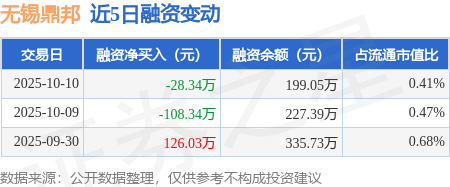 证券之星消息,10月10日,无锡鼎邦(920931)融资买入6.63万元,融资偿还34.97万元,融资净卖出28.34万元,融资余额199.05万元。