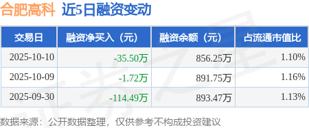 证券之星消息,10月10日,合肥高科(920718)融资买入7.29万元,融资偿还42.8万元,融资净卖出35.5万元,融资余额856.25万元。