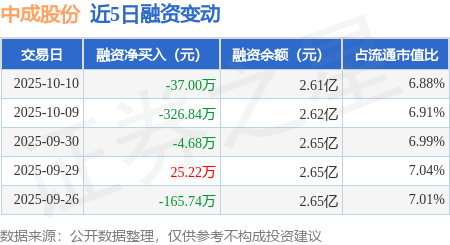 证券之星消息,10月10日,中成股份(000151)融资买入469.76万元,融资偿还506.77万元,融资净卖出37.0万元,融资余额2.61亿元。