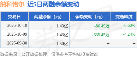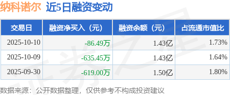 证券之星消息,10月10日,纳科诺尔(920522)融资买入1064.86万元,融资偿还1151.35万元,融资净卖出86.49万元,融资余额1.43亿元。