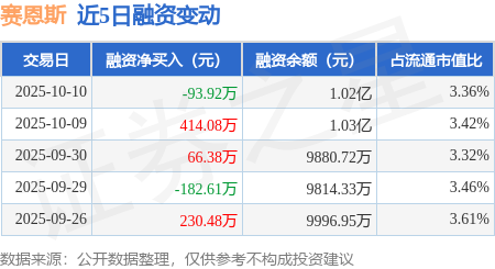 证券之星消息,10月10日,赛恩斯(688480)融资买入530.69万元,融资偿还624.62万元,融资净卖出93.92万元,融资余额1.02亿元。