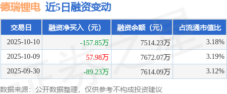 证券之星消息,10月10日,德瑞锂电(920523)融资买入264.66万元,融资偿还422.51万元,融资净卖出157.85万元,融资余额7514.23万元。