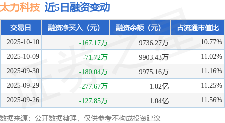 证券之星消息,10月10日,太力科技(301595)融资买入117.01万元,融资偿还284.18万元,融资净卖出167.17万元,融资余额9736.27万元。