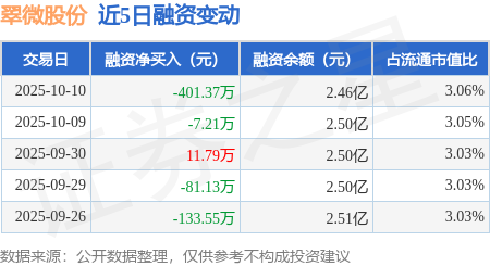 证券之星消息,10月10日,翠微股份(603123)融资买入1103.93万元,融资偿还1505.3万元,融资净卖出401.37万元,融资余额2.46亿元。