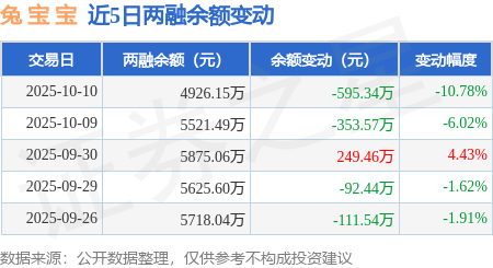 证券之星消息,10月10日,兔 宝 宝(002043)融资买入1043.97万元,融资偿还1657.91万元,融资净卖出613.95万元,融资余额4779.39万元。