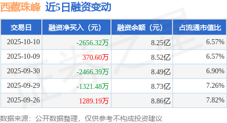 证券之星消息,10月10日,西藏珠峰(600338)融资买入1.1亿元,融资偿还1.36亿元,融资净卖出2656.32万元,融资余额8.25亿元。
