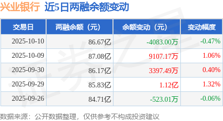 证券之星消息,10月10日,兴业银行(601166)融资买入2.06亿元,融资偿还2.47亿元,融资净卖出4139.93万元,融资余额86.59亿元,近20个交易日中有13个交易日出现融资净买入。