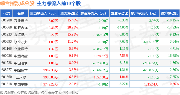 资金流向方面,综合指数(000008)成份股当日主力资金净流出合计12.78亿元,游资资金净流入合计6.19亿元,散户资金净流入合计6.59亿元。成份股资金流向详情见下表: