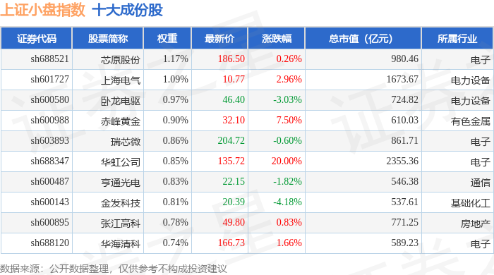 证券之星消息,10月13日,上证小盘(000045)指数报收于5818.28点,涨0.17%,成交2729.63亿元,换手率2.37%。当日该指数成份股中,上涨的有98家,华虹公司以20.0%的涨幅领涨,下跌的有216家,浙江鼎力以7.71%的跌幅领跌。