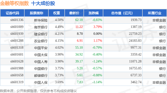 证券之星消息,10月13日,金融等权(000076)指数报收于5428.74点,涨0.16%,成交592.15亿元,换手率0.41%。当日该指数成份股中,上涨的有12家,浦发银行以5.66%的涨幅领涨,下跌的有16家,华泰证券以3.15%的跌幅领跌。
