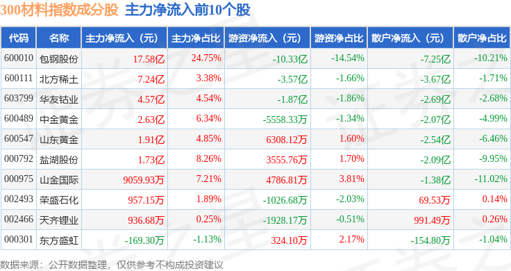 资金流向方面,300材料(000909)指数成份股当日主力资金净流入合计13.2亿元,游资资金净流出合计8.14亿元,散户资金净流出合计5.06亿元。成份股资金流向详情见下表: