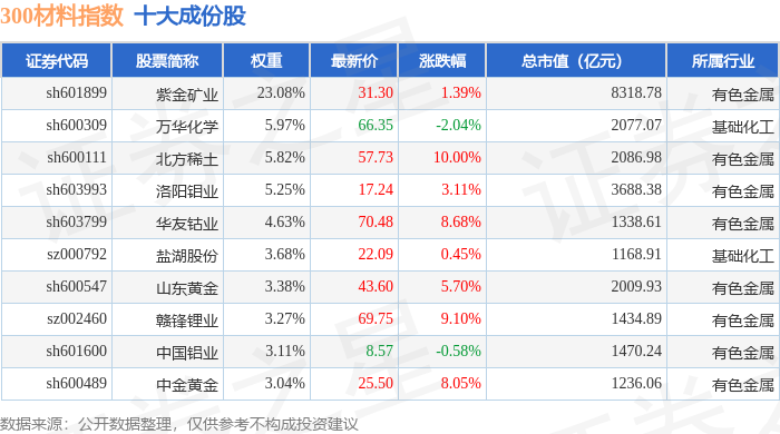 证券之星消息,10月13日,300材料(000909)指数报收于3789.39点,涨1.93%,成交1105.82亿元,换手率3.09%。当日该指数成份股中,上涨的有12家,北方稀土以10.0%的涨幅领涨,下跌的有19家,巨化股份以4.66%的跌幅领跌。