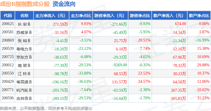 资金流向方面,成份B指(399003)指数成份股当日主力资金净流出合计623.73万元,游资资金净流出合计195.71万元,散户资金净流入合计819.44万元。成份股资金流向详情见下表: