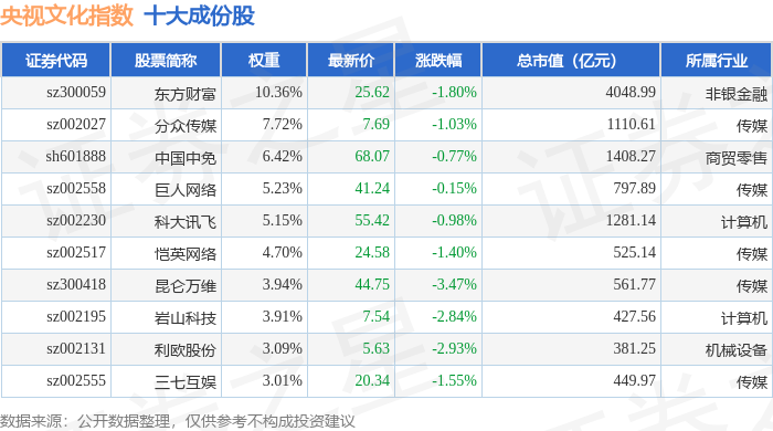 央视文化(399557)指数十大成份股详情如下: