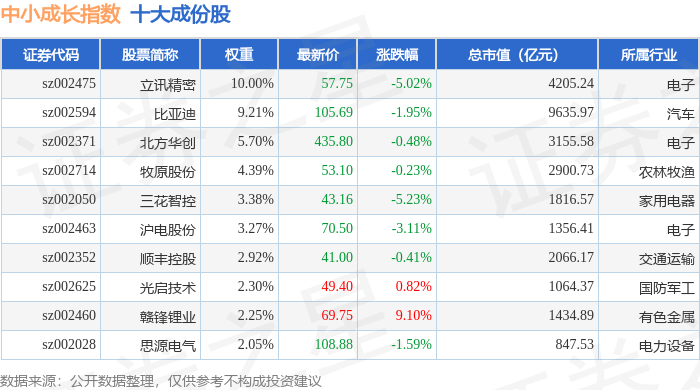 证券之星消息,10月13日,中小成长(399602)指数报收于1270.84点,跌1.2%,成交1515.78亿元,换手率3.62%。当日该指数成份股中,上涨的有27家,赣锋锂业以9.1%的涨幅领涨,下跌的有73家,麦格米特以5.8%的跌幅领跌。