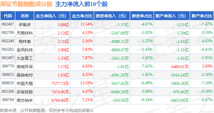 资金流向方面,深证节能(399695)指数成份股当日主力资金净流出合计53.61亿元,游资资金净流入合计7.42亿元,散户资金净流入合计46.19亿元。成份股资金流向详情见下表: