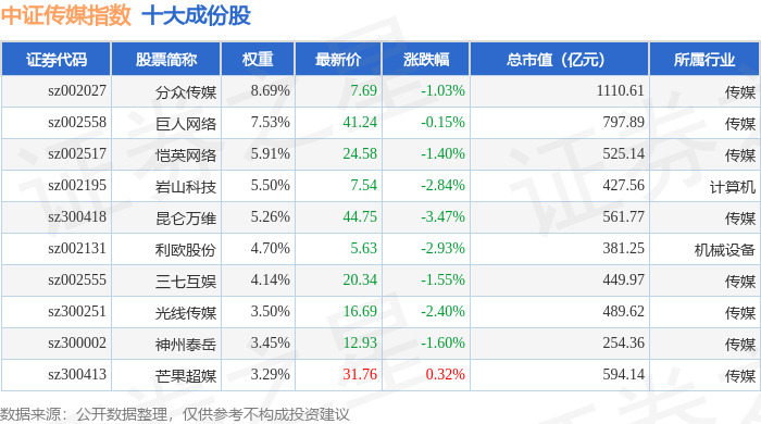 资金流向方面,中证传媒(399971)指数成份股当日主力资金净流出合计11.92亿元,游资资金净流出合计2.93亿元,散户资金净流入合计14.85亿元。成份股资金流向详情见下表: