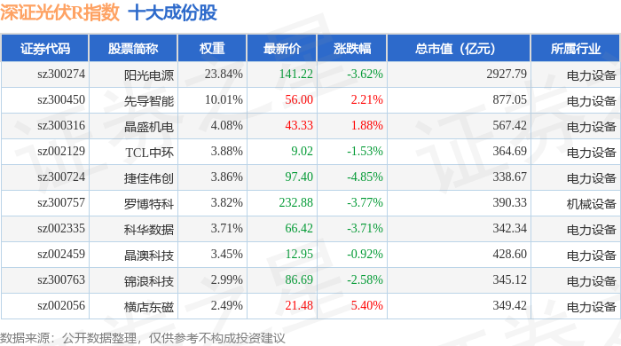 证券之星消息,10月13日,深证光伏R(470035)指数报收于3841.39点,跌1.35%,成交507.61亿元,换手率2.93%。当日该指数成份股中,上涨的有17家,晓程科技以8.63%的涨幅领涨,下跌的有32家,捷佳伟创以4.85%的跌幅领跌。
