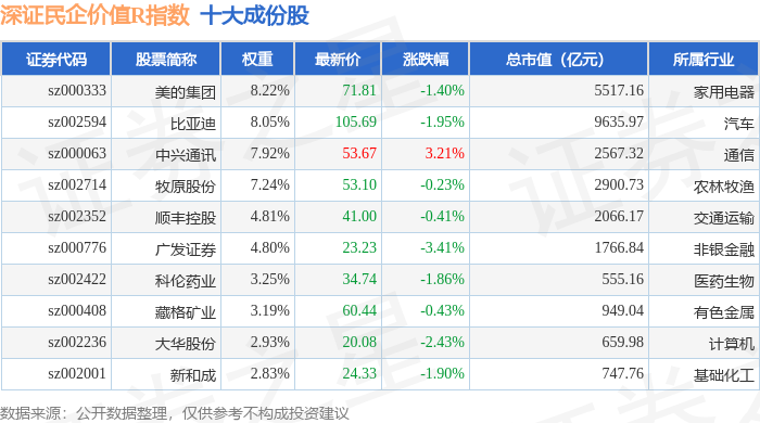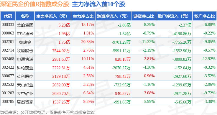 资金流向方面,深证民企价值R(470072)指数成份股当日主力资金净流出合计19.96亿元,游资资金净流入合计5.09亿元,散户资金净流入合计14.87亿元。成份股资金流向详情见下表: