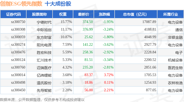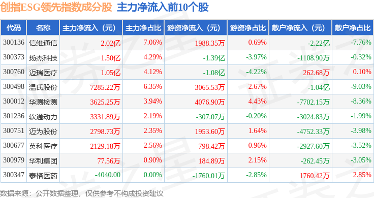 资金流向方面,创指ESG领先(970031)指数成份股当日主力资金净流出合计51.83亿元,游资资金净流入合计7.33亿元,散户资金净流入合计44.5亿元。成份股资金流向详情见下表: