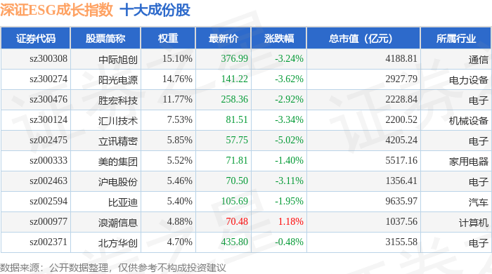 深证ESG成长(970060)指数十大成份股详情如下:
