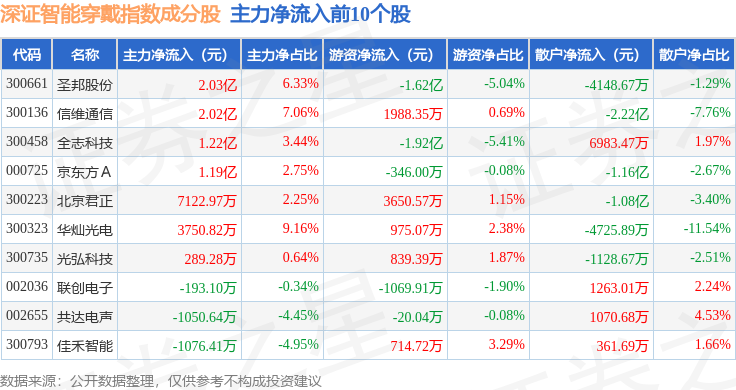 资金流向方面,深证智能穿戴(970074)指数成份股当日主力资金净流出合计46.51亿元,游资资金净流入合计6.69亿元,散户资金净流入合计39.83亿元。成份股资金流向详情见下表: