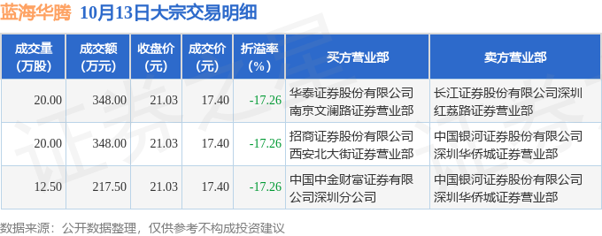 证券之星消息,10月13日蓝海华腾发生大宗交易,交易数据如下: